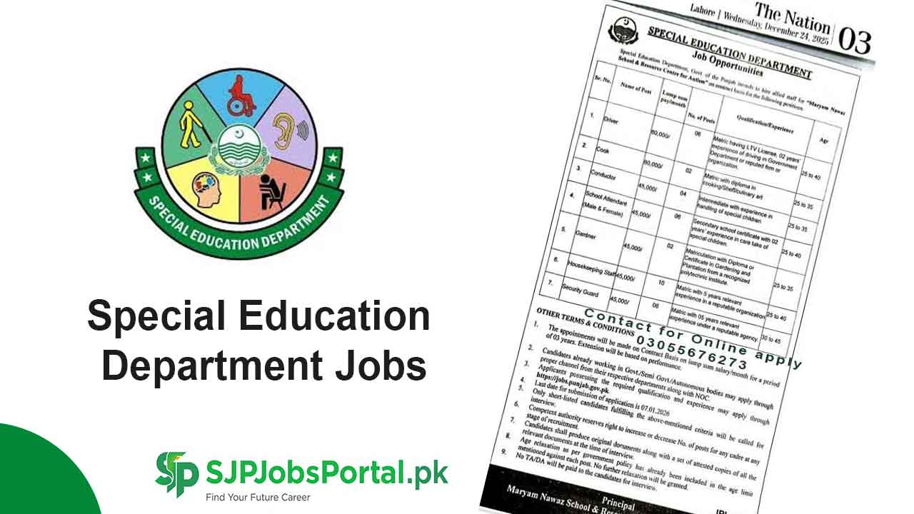 Special Education Department Jobs 2025 Punjab has been announced officially. Candidates from Punjab can qualify for Special Education department latest jobs of Driver, School Attendant, Cook, Sweepers, Clerk, Gardner, Conductor, Security Guard, Housekeeping, and also female school attendant. Individuals whose domicile from Punjab and age 18 to 45 years males and females both can apply online for Jobs 2025. Punjab Special Education Department Jobs last date is 7th January 2026. Interested candidates can apply online via Punjab jobs portal.